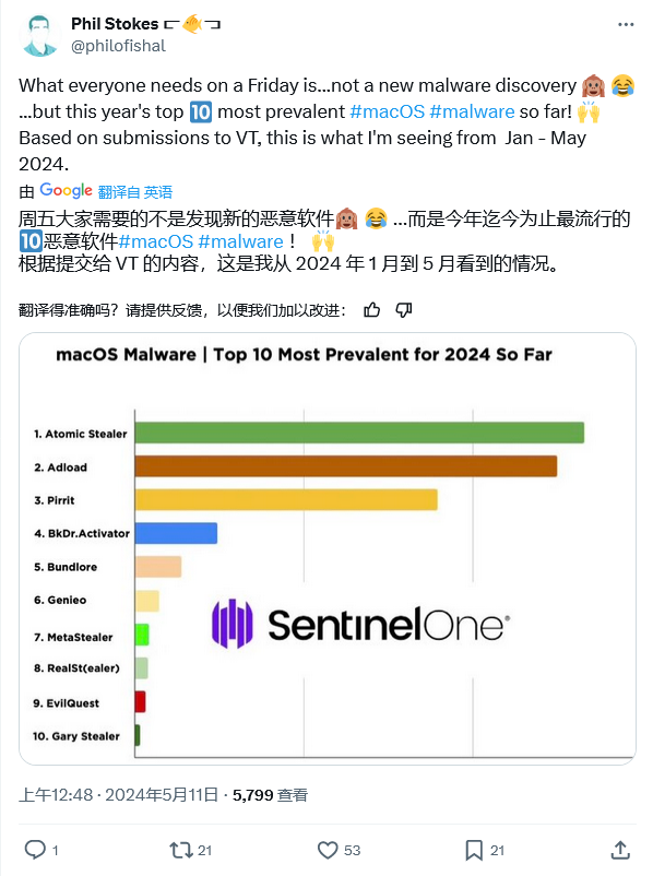5 月 20 日消息,网络安全公司 Sentinal One 的安全研究员兼博主 Phil Stokes 于 5 月 11 日发布博文,统计了今年 1-5 月针对苹果 macOS 系统的恶意软件数量,发现勒索软件、木马和后门程序仍然占据主导地位。