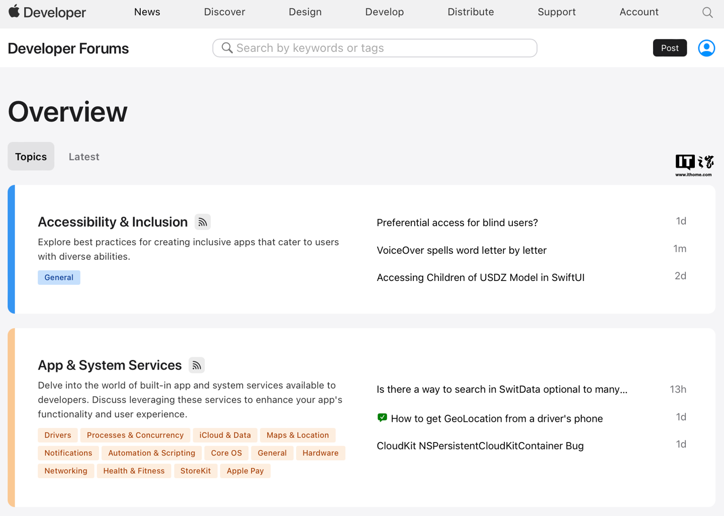 据悉,目前苹果开发者论坛主要按照主题划分大类,以帮助开发者精确查找所要的内容,每个大分类还包含了一些更具体的子主题,其中包含一系列开发者可能感兴趣的问题。