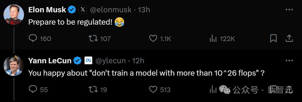 在马斯克的回复下面,LeCun 也毫不示弱,他问道「你对『不要训练超过 10^26flops 的模型』感到高兴吗?」