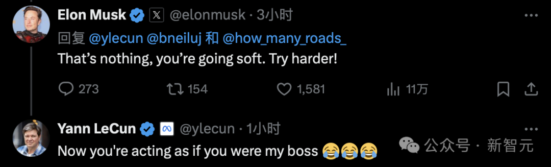 另一边,在马斯克刚刚转发自家 xAI 公司招募帖子下面,LeCun 又开始阴阳怪气起来。