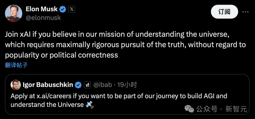 如果你相信我们理解宇宙的使命,就加入 Xai 吧!这需要在追求真理道路上必须秉持最大的严谨,而不受流行去世或政治正确性的影响。