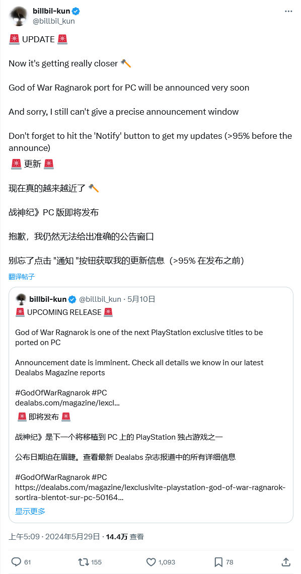 5 月 29 日消息,消息源 Billbil-kun 今天在 X 平台发布推文,表示索尼和圣莫尼卡工作室即将在 PC 平台发行《战神:诸神黄昏》(God of War Ragnarok)游戏,但目前尚不清楚确切的日期。