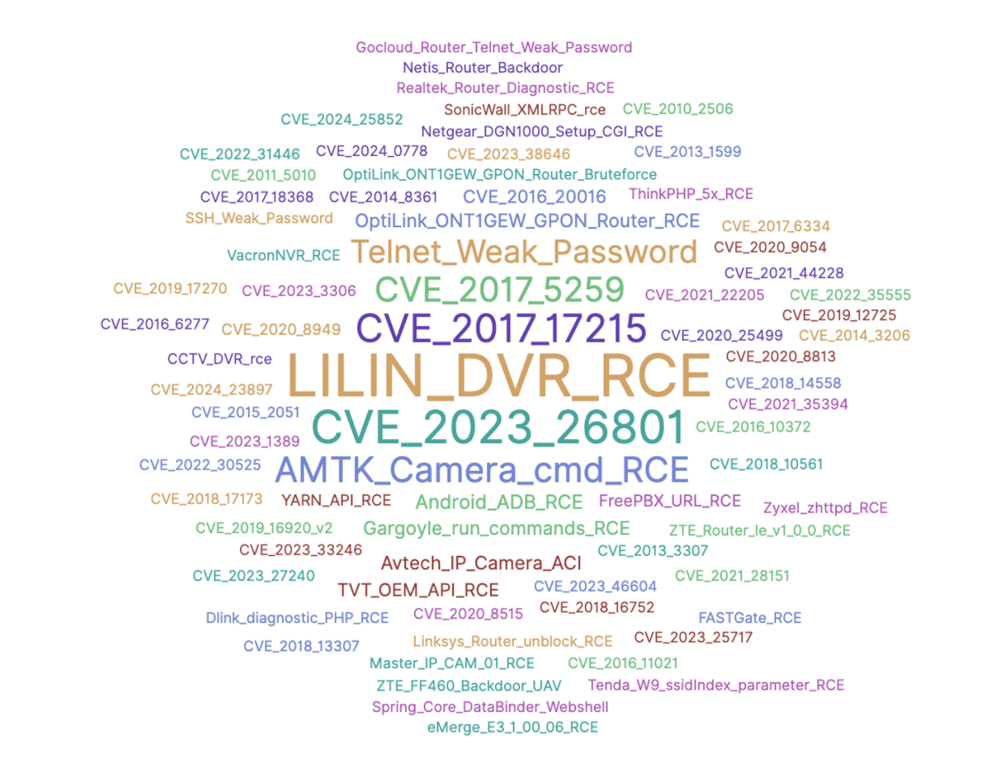 黑客利用的漏洞类型非常广泛,波及美国、中国、法国、德国、巴西等国家地区的云服务提供商及教育学术机构,主要针对思科、华为、网件、瑞昱、希捷、腾达、TP-Link、中兴等厂商的网络设备进行攻击。
