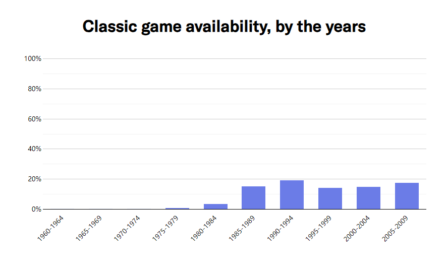排在 90 年代之后的是 2005-2009 年(17.89%)。在 1985 年之前发布的游戏中,只有不到 3% 的游戏至今仍在发行。这个数据有多低呢,略高于二战前录音的可用性,略低于美国无声电影的保留率。