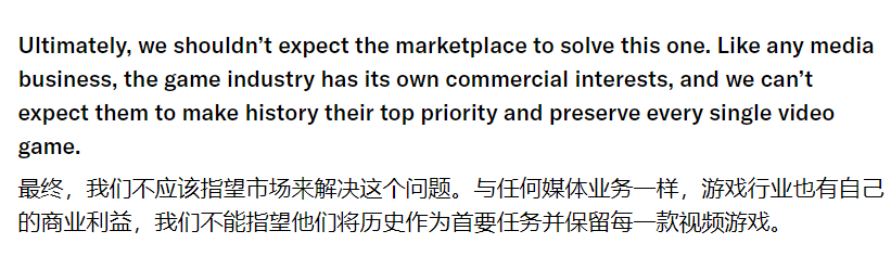 “与任何媒体业务一样,游戏行业也有自己的商业利益,我们才不指望他们能将历史作为自己的首要任务去保留每一款游戏。”