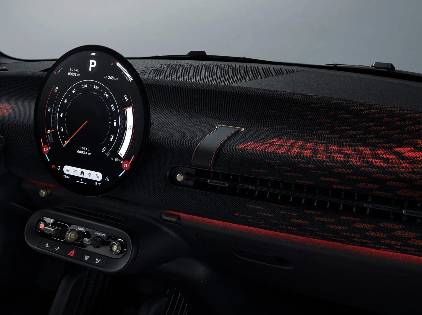 新车车内配备了智能手表风格的直径 240mm 圆形中控屏,系列车机基于 Android 开源项目(AOSP)的“MINI 操作系统 9”,支持个人语音助理、导航、游戏、流媒体、手机数字钥匙等特性。