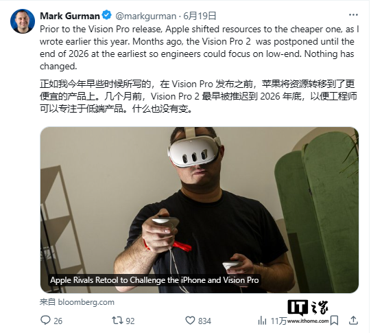 因此,9to5mac 认为苹果可能会为现有 Vision Pro 提供一次规格升级。苹果叫停 Vision Pro 2 的研发并不意味着不会有新款 Vision Pro,仅仅意味着短期不会有一款真正意义上的下一代高端 Vision Pro 继任者。IT之家注意到,彭博社记者 Mark Gurman 称,The Information 的报道并非新消息,他今年早些时候就已经报道了相关内容,他当时表示 Vision Pro 2 被推迟到最早 2026 年底推出,以便苹果工程师可以专注于研发更低端的产品。