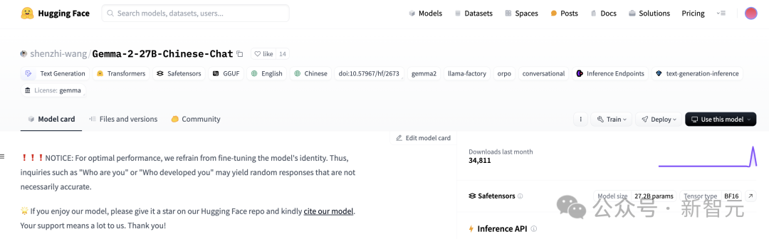 更让人惊喜的是,1 天之后,27B 的微调版本也上线了。根据 HuggingFace 主页信息,模型的下载量已经超过了 3.4 万。