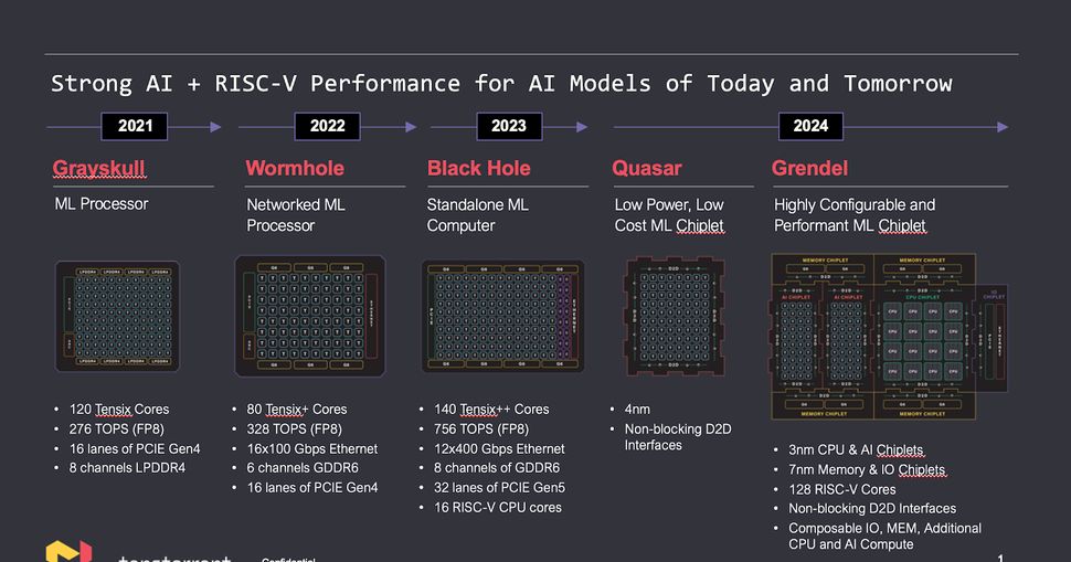 根据 Tenstorrent 去年秋季发布的最新路线图,该公司打算发布 Black Hole 独立 AI 处理器和用于多芯片 AI 解决方案的 Quasar 低功耗低成本芯片。