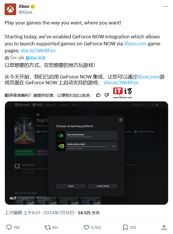 微软 Xbox 官方账号今天在 X 平台发布推文,宣布玩家现在访问 Xbox.com 网站的游戏界面,点击按钮之后可以选择启动英伟达 GeForce NOW,直接在该云服务上开始游戏。附上相关截图如下: