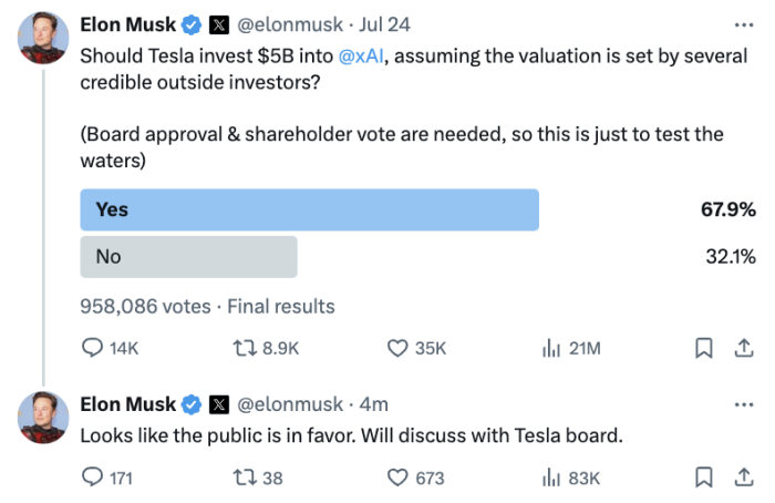 7 月 25 日消息,特斯拉 CEO 马斯克在社交平台表示,将就投资 xAI 事项与特斯拉董事会进行讨论。