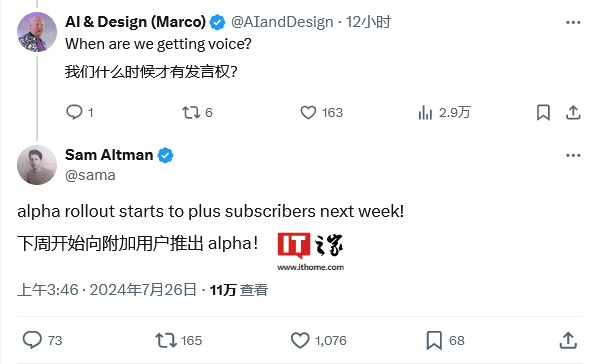 7 月 26 日消息,OpenAI 首席执行官山姆・阿尔特曼(Sam Altman)今天回复网友提问,表示将于下周面向 ChatGPT Plus 用户,开放 Alpha 版本 GPT-4o 的语音模式(Voice Mode),实现无缝聊天。