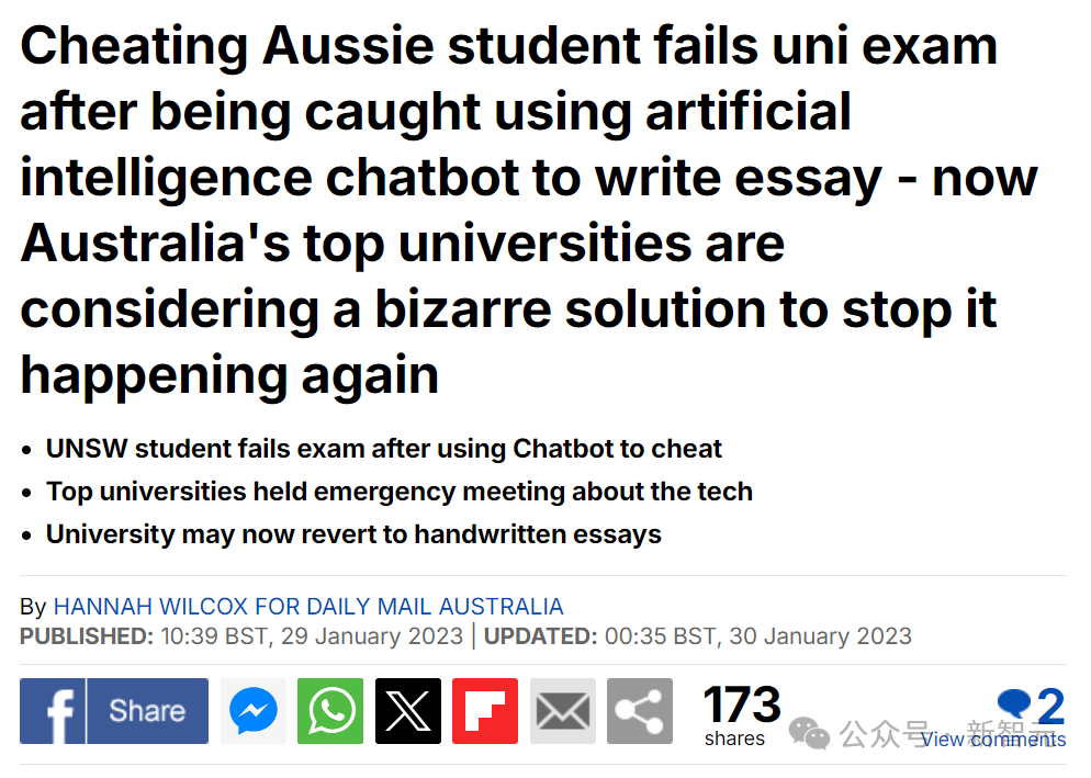 《每日邮报》2023 年 1 月 30 报道称,UNSW 的 1 名学生使用 ChatGPT 自动生成论文被抓,这也是全澳第一个使用 AI 技术作弊被抓的学生。