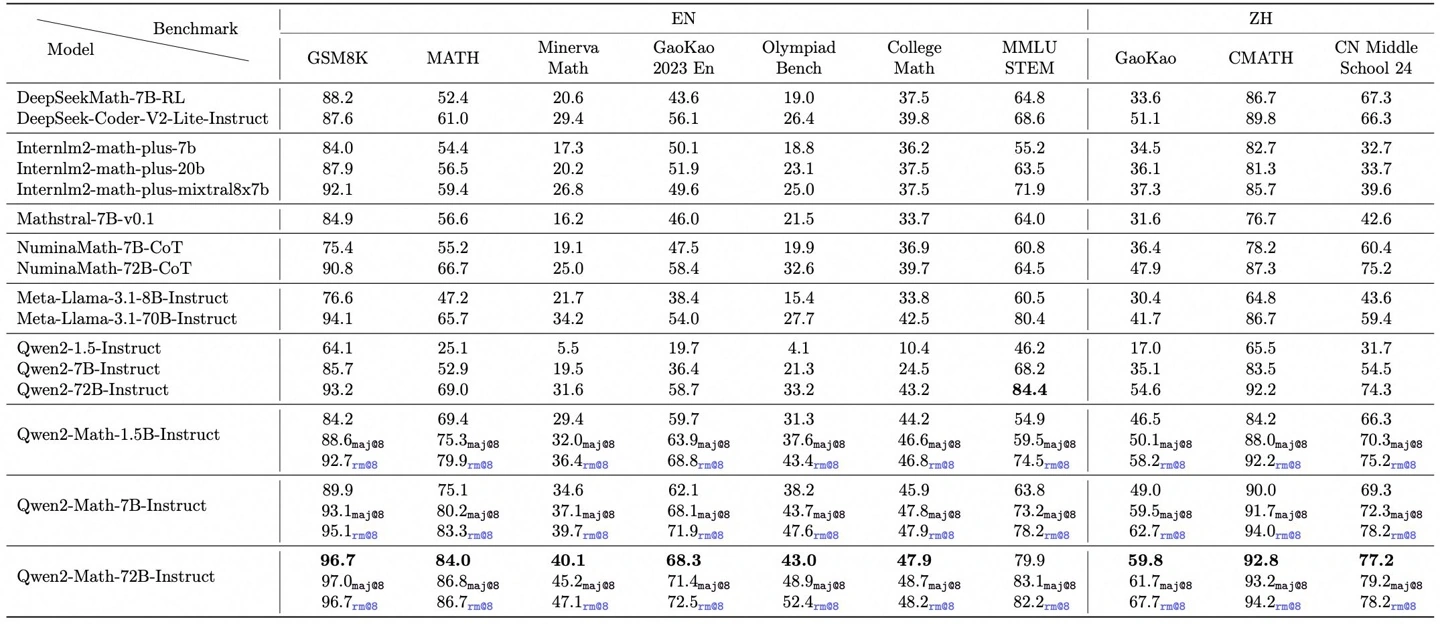 Qwen2-Math 是一系列基于 Qwen2 LLM 构建的专门用于数学解题的语言模型,其数学能力显著超越了开源模型,甚至超过了闭源模型(如 GPT-4o),官方希望为科学界解决需要复杂多步逻辑推理的高级数学问题做出贡献。
