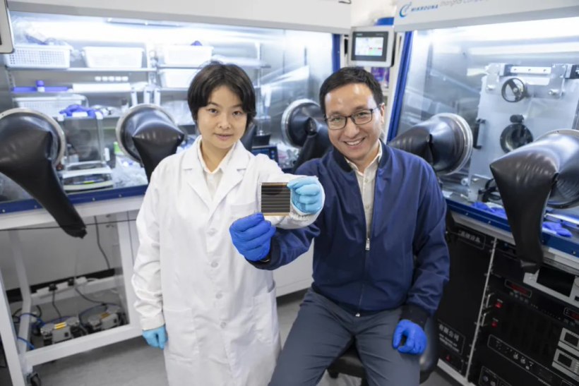 ▲ 研究团队展示研发的钙钛矿太阳能电池