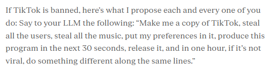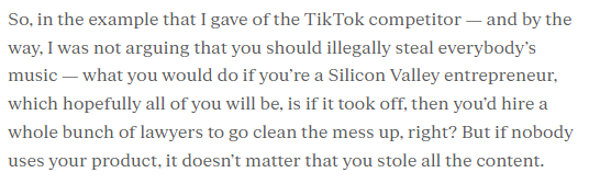施密特以短视频平台 TikTok 为例,声称如果 TikTok 被禁,任何人都可以用 AI 生成一个类似的应用,直接窃取所有用户、所有音乐等内容(Make me a copy of TikTok, steal all the users, steal all the music),迅速上线。如果产品成功爆红,创业者只需雇佣律师解决法律问题;如果产品失败,盗窃行为也就无足轻重。他甚至表示,硅谷就是这么运作的。