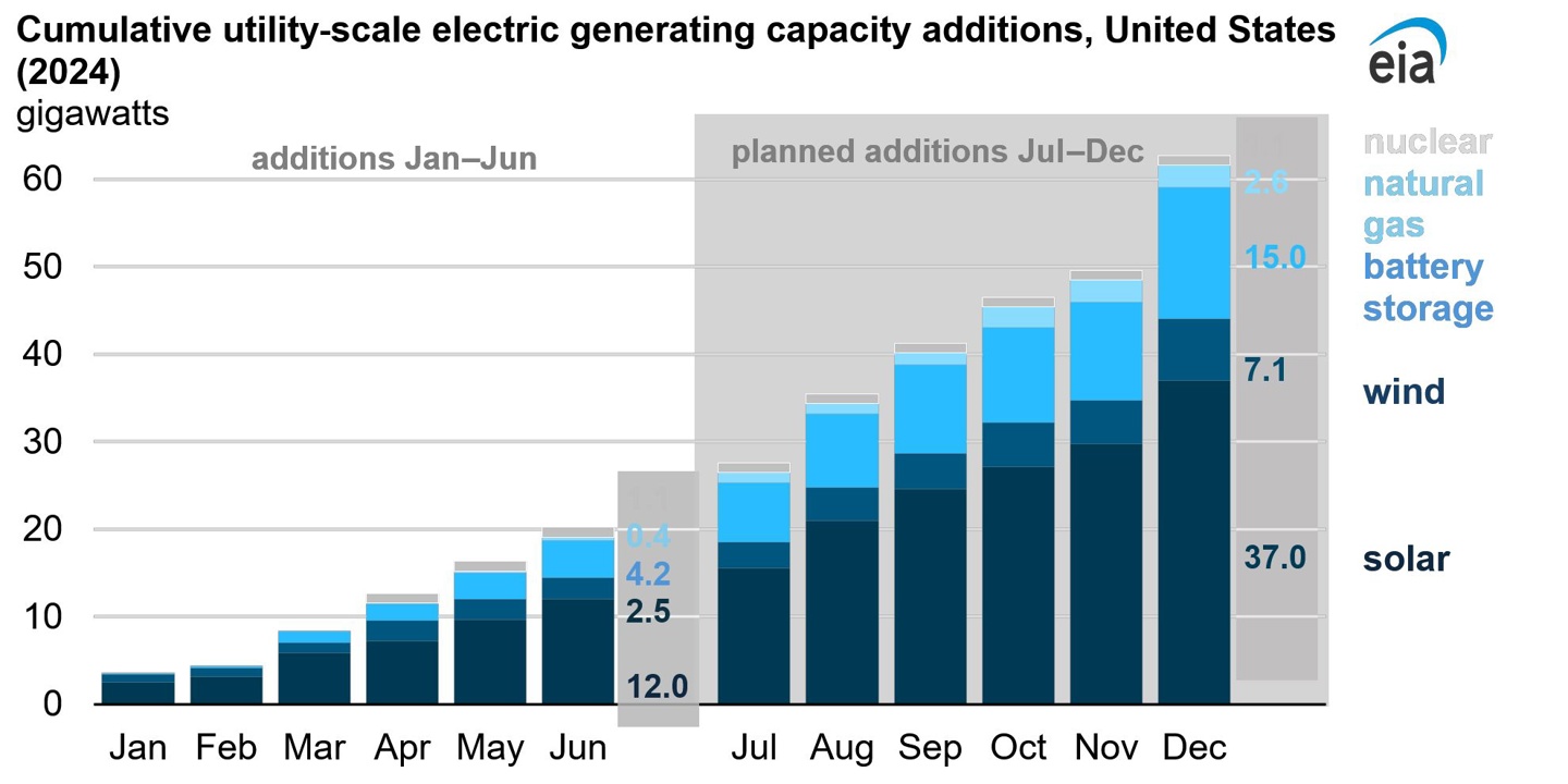 EIA 预估在今年剩余时间里,太阳能发电占据年度新增装机规划中占据核心地位,将占计划发电量的近 60%。据该机构称,新项目将让今年的太阳能发电量达到 37 吉瓦,这将创下新的纪录。
