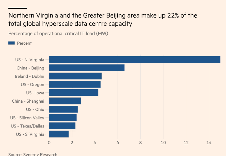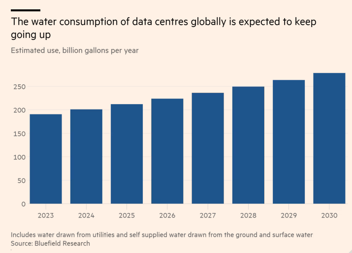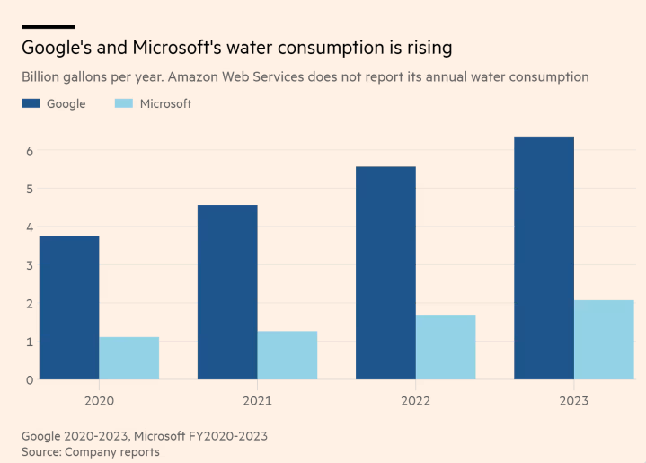 根据 FT 报道,世界上最大的数据中心集中地美国弗吉尼亚州,2019 年至 2023 年期间,用水量增加了近三分之二,从 11.3 亿加仑增至 18.5 亿加仑。
