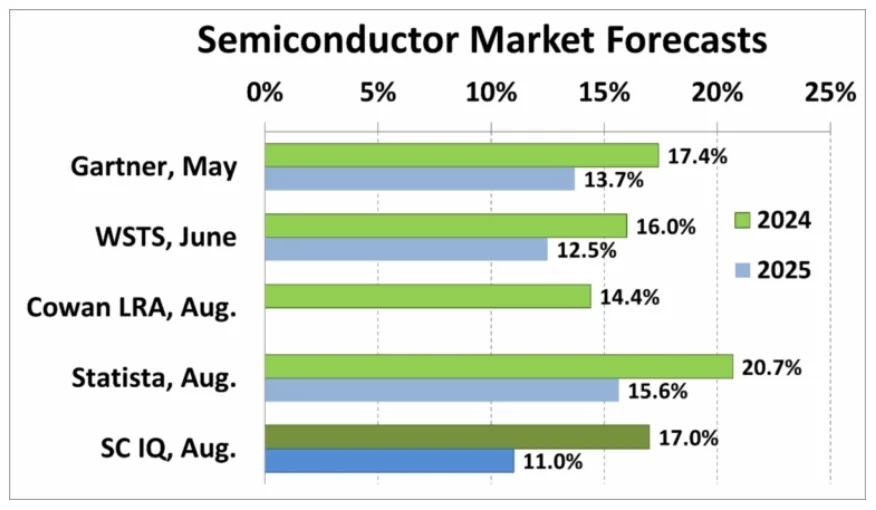 2024 年上半年半导体市场的大幅增长(较 2023 年上半年增长 18%)将推动 2024 年全年的强劲增长。过去几个月对 2024 年的预测范围从 Cowan LRA 模型的 14.4% 到 Statista Market Insights 的 20.7%。我们的半导体情报 (SC-IQ) 预测 2024 年将增长 17.0%,与 Gartner 的 17.4% 和 WSTS 的 16.0% 一致。