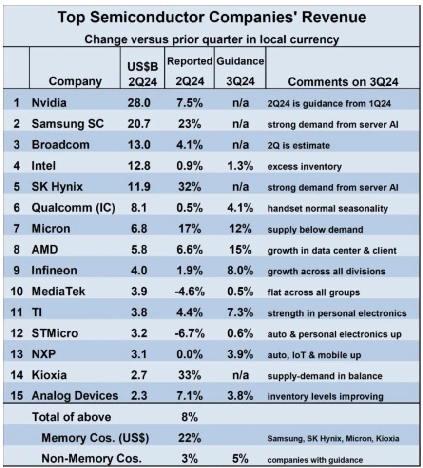 与 2024 年第一季度相比,主要半导体公司 2024 年第二季度的收入增长普遍强劲。在排名前十五的公司中,只有两家公司(联发科和意法半导体)在 2024 年第二季度的收入出现下滑。增长最强劲的是内存公司,SK Hynix 和 Kioxia 分别上涨超过 30%,三星半导体上涨 23%,美光科技上涨 17%。2024 年第二季度与 2024 年第一季度相比,排名前十五的公司加权平均增长率为 8%,其中内存公司上涨 22%,非内存公司上涨 3%。