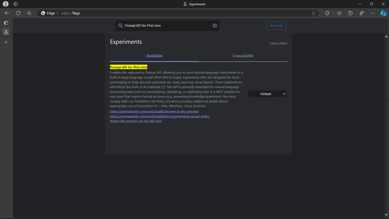如果你使用 Microsoft Edge Canary 版则可以升级到最新版后在 Edge://flags 里找到选项:edge://flags#edge-llm-prompt-api-phi-mini