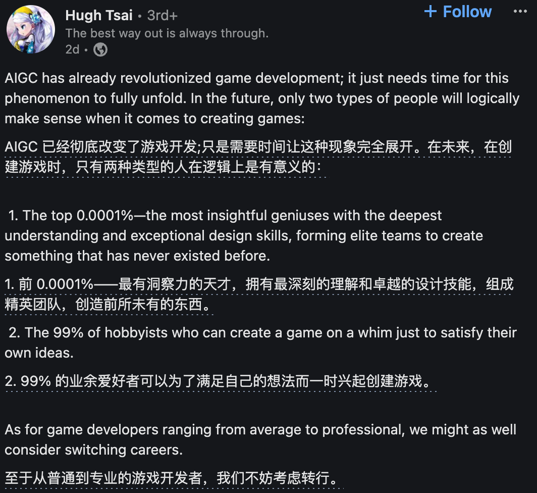 导火索 2:一向低调的米哈游创始人蔡浩宇,久违的公开发表“暴论”,用 AI 劝退游戏从业者。