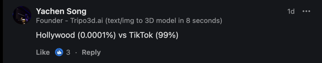 AI 3D 内容生成公司 VAS 创始人宋亚宸补充道,蔡浩宇说的前 0.0001% 相当于好莱坞大片,那么 99% 就类似现在人人都可以拍视频的抖音。