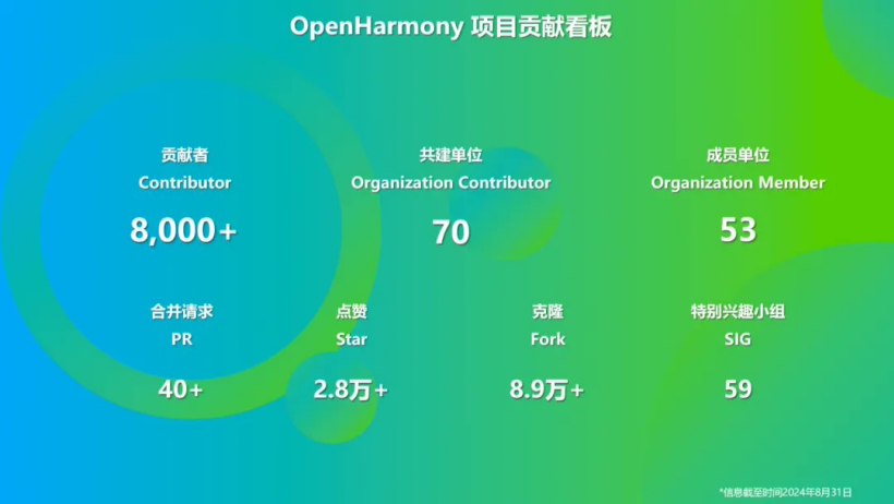截至 2024 年 8 月 31 日,OpenHarmony 社区累计超过 8000 名贡献者,共 70 家共建单位,产生 2.8 万多个 Star,8.9 万多个 Fork,59 个 SIG。