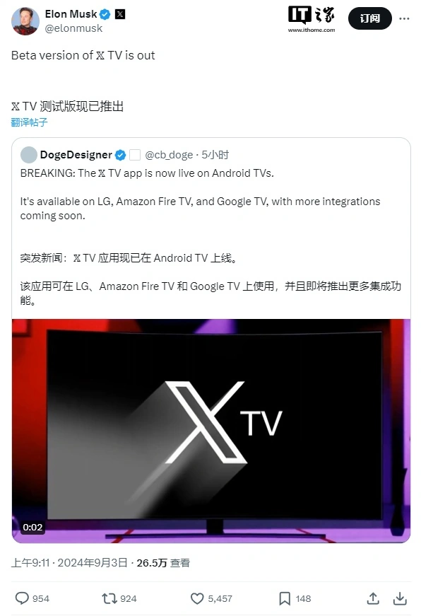 9 月 3 日消息,马斯克刚刚表示,旗下  ? 平台现已推出 TV 测试版,但目前仅支持在 LG 电视(大概运行 webOS)、Amazon Fire TV 和 Google TV 上使用。