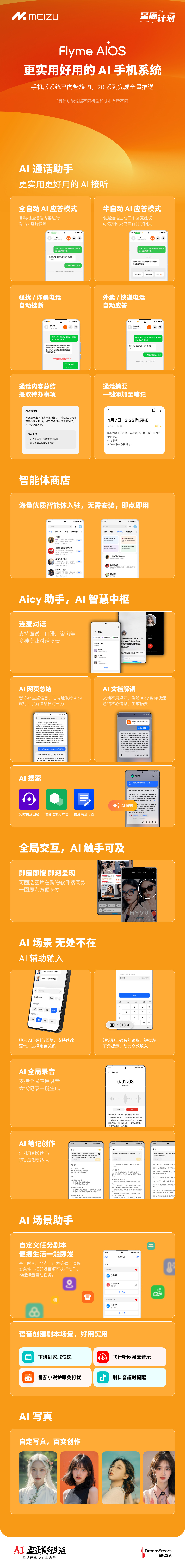 9 月 8 日消息,魅族 Flyme AIOS 手机版系统已向魅族 20、21 系列手机完成全量推送,官方现公布该系统新版本特性,支持 AI 通话助手等功能。其中部分功能已上线魅族 21 稳定版和魅族 20 内测版 Flyme AIOS。