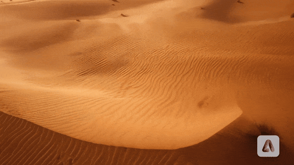 提示:无人机上的摄像机飞过沙漠的镜头,风吹过沙丘,下面的沙子形成波浪。