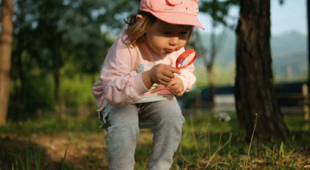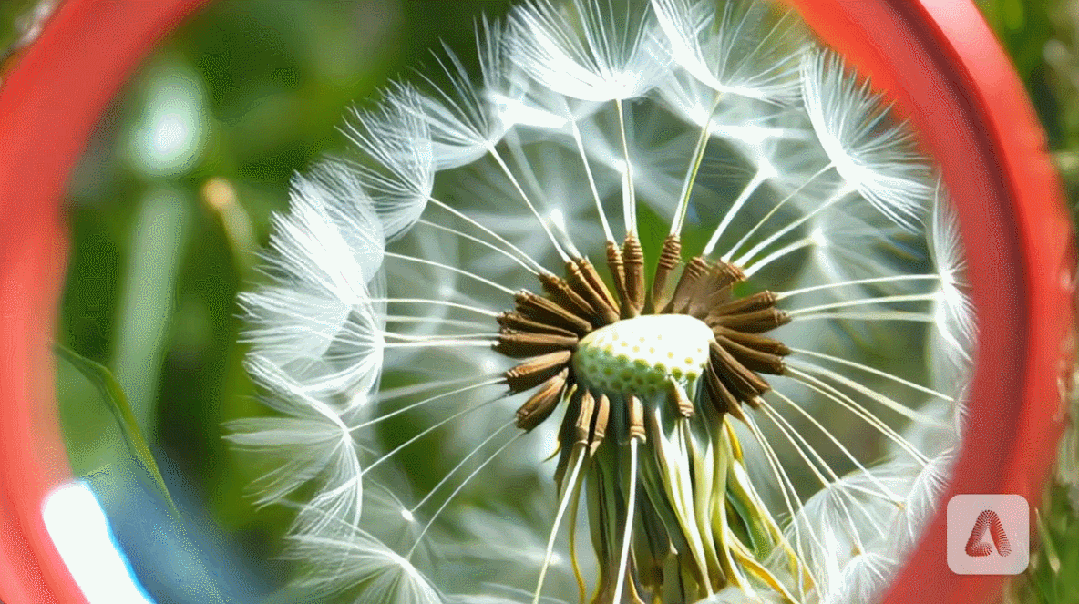 下面是根据提示生成的新片段,提示语为:透过大红色放大镜观察白色蒲公英,特写。