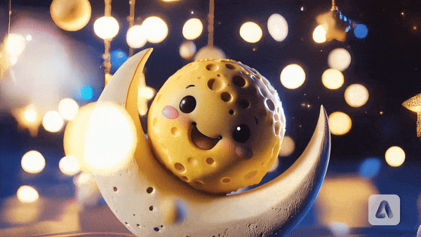 再比如,给定提示:月亮上可爱的奶酪球在微笑,3D 渲染,octane,柔和的灯光,梦幻般的散景,背景中浮光闪闪: