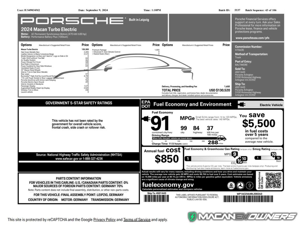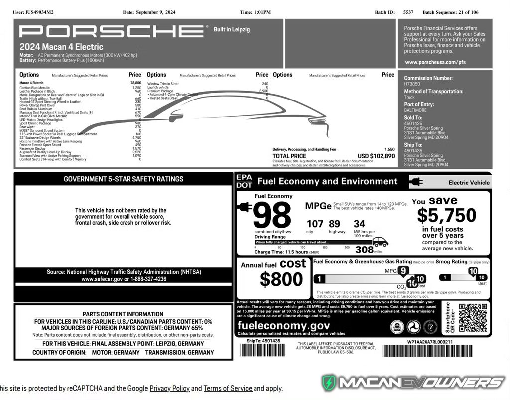 9 月 13 日消息,2024 款保时捷 Macan EV 将于 9 月 18 日上市,并已获得官方 CARB 认证。Macan EV 车主论坛上有网友分享了 Macan 4 和 Macan Turbo 的蒙尼罗标签,揭示了保时捷首款电动 SUV 在官方宣布前的 EPA 预估续航里程。