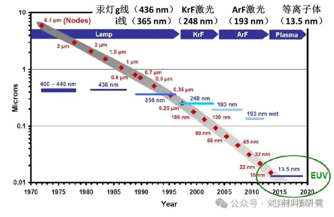 光刻机按照精度由粗到精分类排序依次为:g线、i线、KrF、ArF、EUV,如下图。