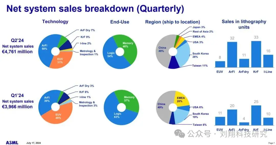 ArF按照光路介质(空气或水),又可以分为ArF Dry(干法,介质为空气)和ArFi(湿法,i=immersion浸没式,介质为水)。因为水的折射率为1.33,在空气中波长为193nm的光线进入水中波长就会变成193/1.33=145nm,波长变短,精度就变高。所以ArFi可以认为比ArF Dry更先进。所以ASML最新一个季度财报按照精度依次分类就是:I-line、KrF、ArF Dry、ArFi、EUV,如下图。(有关ASML更详细情况可参考我7月份写的公众号文章:光刻机,你以为的ASML和真实的ASML)
