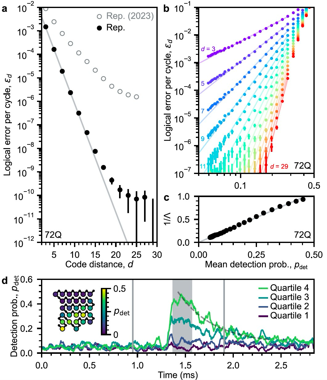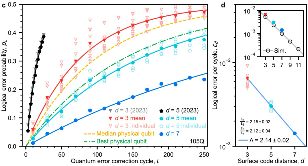 左图为不同码距的表面码纠错下的逻辑错误率,图中同时引用 2023 年两个 d=3 纠错码的数据;横轴为纠错周期数,曲线越平缓,表明错误率越低。右图为不同码距错误率拟合的错误抑制系数 Λ,在这里为 2.14,意味着系统错误率不到表面码纠错错误率阈值的二分之一;随着码距的增加,纠错后错误率将以指数形式快速下降。丨图片来源:参考文献 [1]