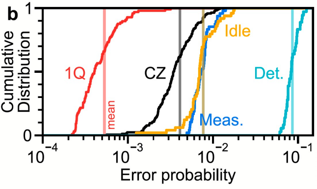 最新的 105 量子比特芯片性能统计。图中画的是不同类型错误的累计直方图。红色:单比特门错误率;黑色:两比特 CZ 门错误率;黄色:闲置(即不做任何操作)时的错误率;蓝色:读取(测量)错误率;浅蓝:权重-4 探测概率。