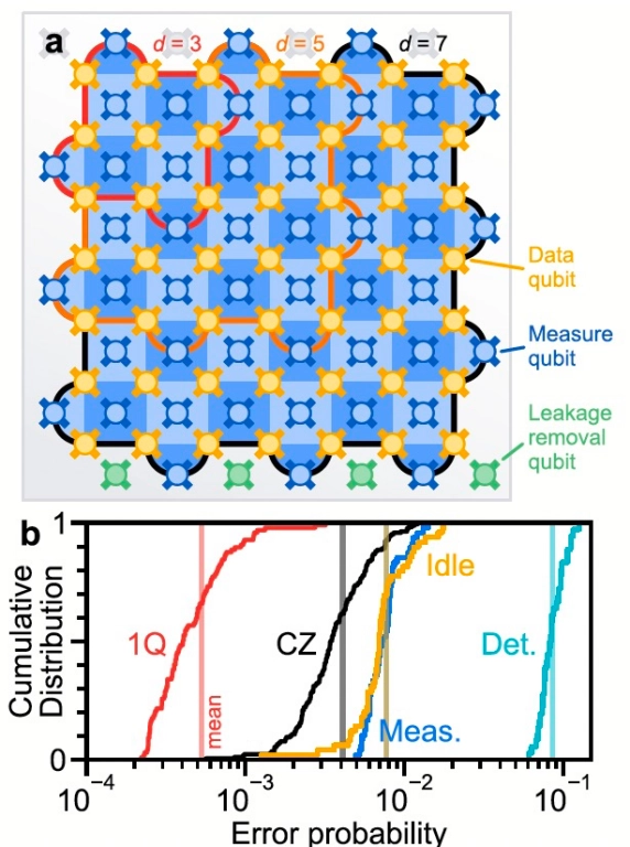 另一个亮点是团队为了试探系统的错误率背景极限,测试了码距为 29 的“重复码”—— 它可以看作表面码的一维情况,它不能同时侦测所有的 Pauli 错误(指错误可以表示为 Pauli 矩阵的线性组合;举例来说,量子态绕 X 或 Z 轴翻转了 180 度),只能侦测比特翻转或相位翻转中的一种。测试结果表明,在码距达到大约 25 之后,逻辑错误率就饱和了,大概为百亿分之一(10-10)的水平。团队发现这一背景错误率来源于大约每小时发生一次的不明来源的关联错误。而在之前的芯片上,这个错误率背景是百万分之一,团队认为这是由于大概几十秒一次的高能事件,也就是宇宙射线轰击芯片所导致的。因此,这有可能成为未来量子纠错技术的一个新课题。