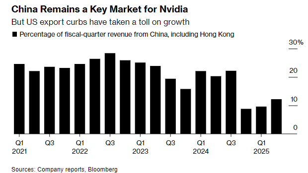 作为全球市值最高的芯片制造商,英伟达的销售额飙升,全球数据中心运营商竞相购买其处理器。尽管贸易限制产生了一定影响,但中国仍是重要的市场。在7月份的财报季中,英伟达来自中国的收入占其总收入的12%,约为37亿美元,其中包括香港。