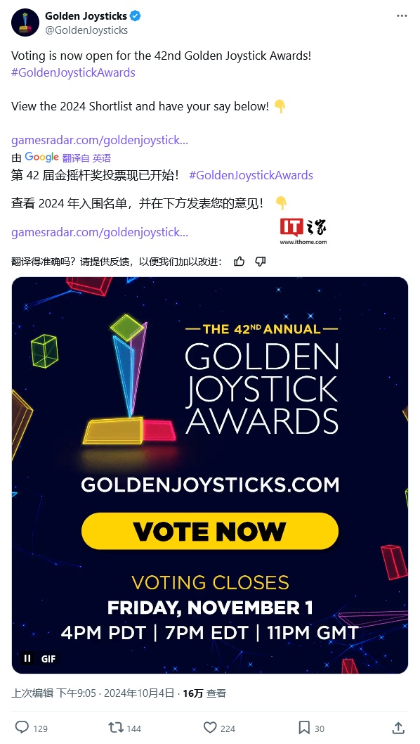 10 月 5 日消息,第 42 届金摇杆奖(Golden Joystick Awards)于昨日(10 月 4 日)公布了入围游戏名单,并开放了玩家投票通道。