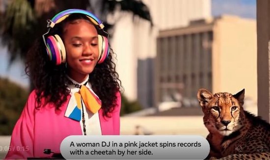 Meta展示的一个视频显示,用户可以提供一个女孩的照片,输入文字“一名身穿粉色马甲的女DJ播放唱片,她身旁有一只猎豹”,然后就生成了以照片中女孩形象的DJ打碟,以及一只猎豹陪伴。