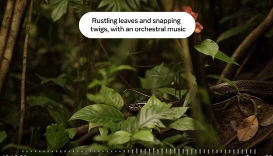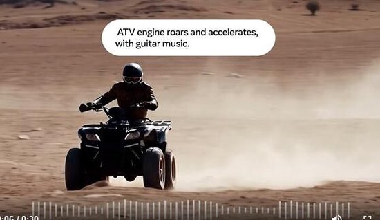 Meta提供的一个例子是,生成在吉他音乐的伴奏下,全地形车(ATV)引擎轰鸣加速的声音,还有一个例子是,管弦乐声中有树叶沙沙作响和树枝折断的声音。