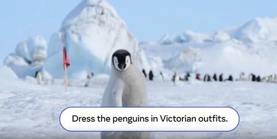 Meta提供的示例之一是,用户输入,让企鹅穿上有英国女王维多利亚在位时期服饰风格的服装,Movie Gen生成的企鹅穿上了带蕾丝的红色女裙。