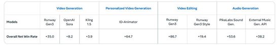 Meta还展示了针对以上四种能力进行的A/B对比测试人工评估结果,下图显示的净正值胜率代表,相比Sora等竞品模型,人类评估者更青睐Movie Gen模型生成的结果。在直接生成视频这个功能方面,Movie Gen相比Sora的净胜率达到8.2。