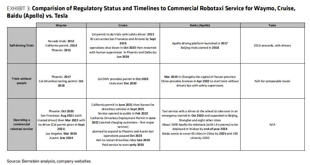伯恩斯坦在报告中指出,特斯拉在监管批准方面落后于竞争对手,目前该公司没有进行无人驾驶测试,而Google旗下的Waymo自2017年以来一直在进行。