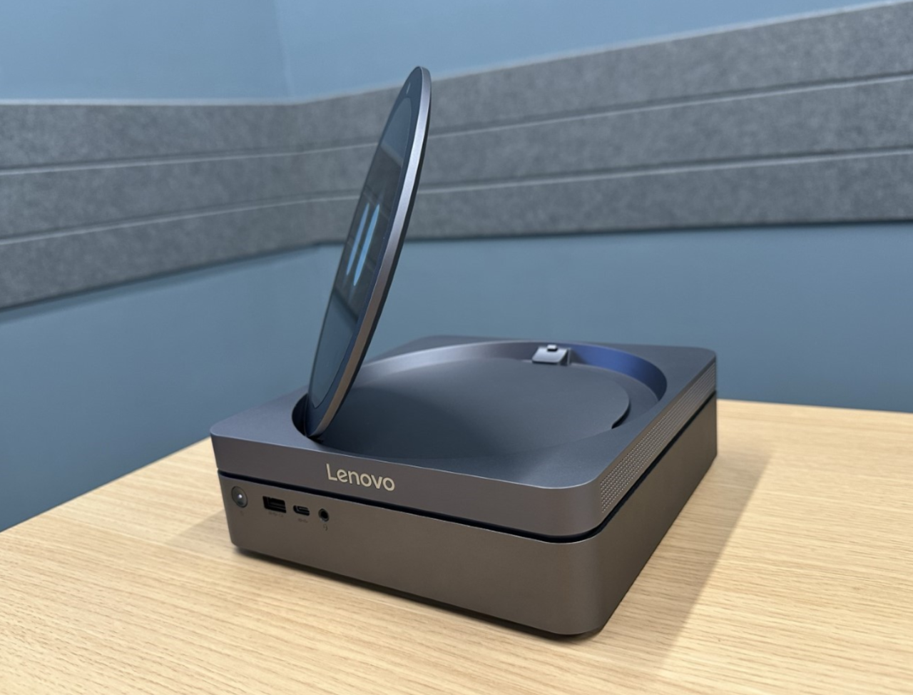 联想 AI Buddy 看起来像一个圆形的超大版本可折叠 MagSafe 充电底座,盖子上有一个圆形显示屏,用于显示 AI 助手的表情等。