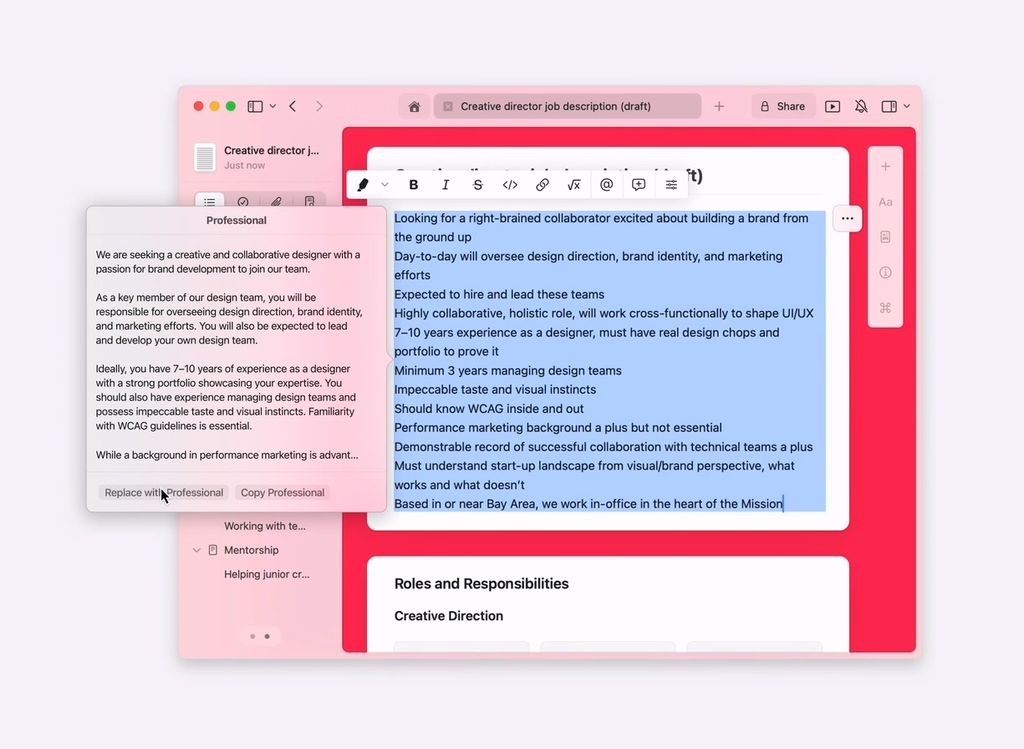 使用 Writing Tools 时,Apple 智能可为用户输入的文本提供不同版本供用户选择,还可根据目标读者和当前任务调整文本调性,令其读来专业、简练或亲切。