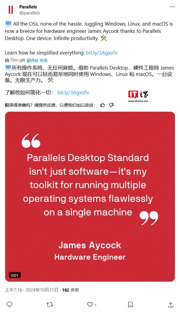 IT之家注:新版 Parallels Desktop 现阶段仅支持 Writing Tools 这一项 Apple Intelligence 功能,不过官方表示正积极拓展,后续会为用户带来更多功能。