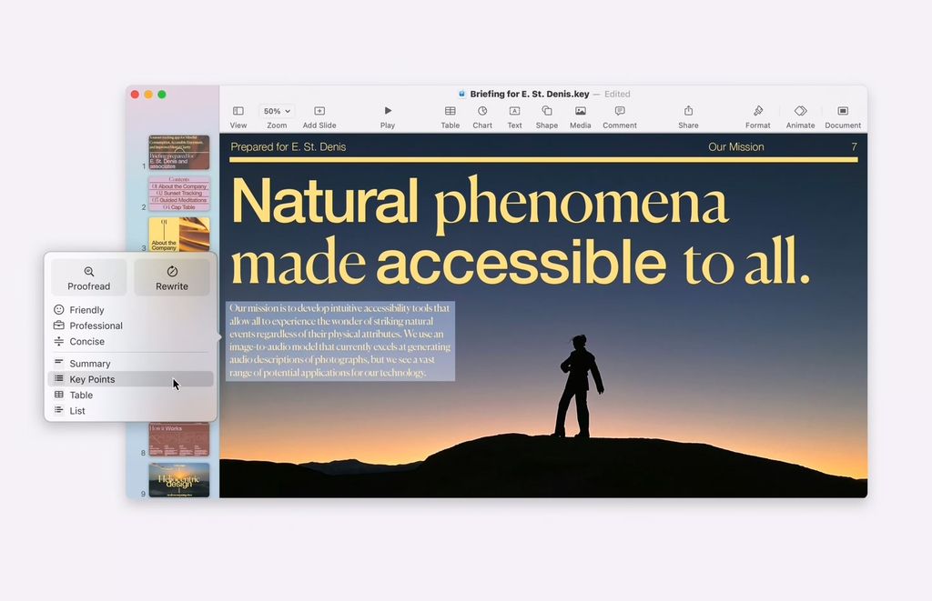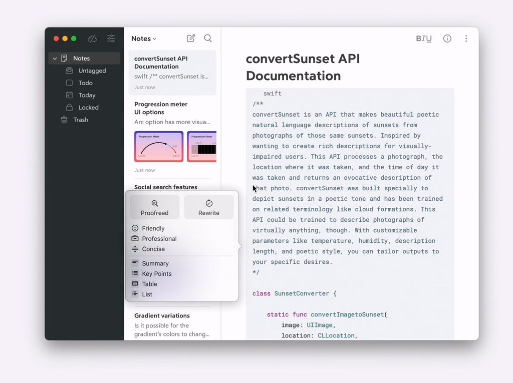Writing Tools 深度集成于 iOS、iPadOS 和 macOS 系统,帮助用户优化语言,可在几乎任何文本输入处对输入文本进行改写、校对和摘要,包括邮件、信息、备忘录、Pages 文稿及各类第三方 app。